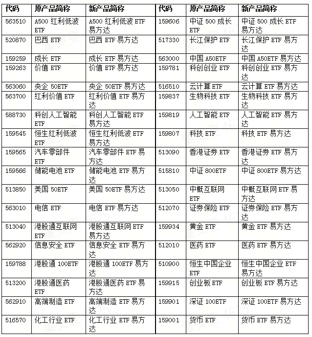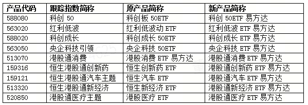 例如,對於通過港股通機制投資港股的行業主題ETF,在簡稱中加入“港股通”字樣,如將跟蹤恒生港股通創新藥指數的“恒生創新藥ETF”調整爲“港股通創新藥ETF易方達”;去掉冗餘漢字或數字,如將跟蹤科創50指數的“科創板50ETF”調整爲“科創50ETF易方達”,將跟蹤科創成長指數的“科創成長50ETF”更名爲“科創成長ETF易方達”。