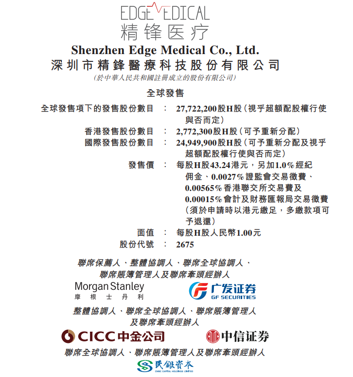 12月30日,精鋒醫療-B於12月30日至1月5日招股,公司擬全球發售2772.22萬股H股,其中,香港發售佔10%,國際發售佔90%,另有超額配股權15%。每股發售價43.24港元,每手100股,預期將於2026年1月8日開始在聯交所買賣。