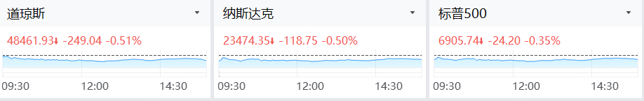 受大宗商品巨幅波動引發的緊張情緒推動,隔夜美股三大指數集體收跌。截至收盤,標普500指數跌0.35%,報6905.74點;納斯達克綜合指數跌0.5%,報23474.35點;道瓊斯工業平均指數跌0.51%,報48461.93點。