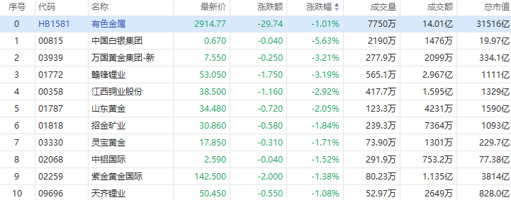 華盛資訊12月30日訊,港股有色金屬概念股普跌,贛鋒鋰業跌超3%,江西銅業股份跌近3%,山東黃金跌超2%。