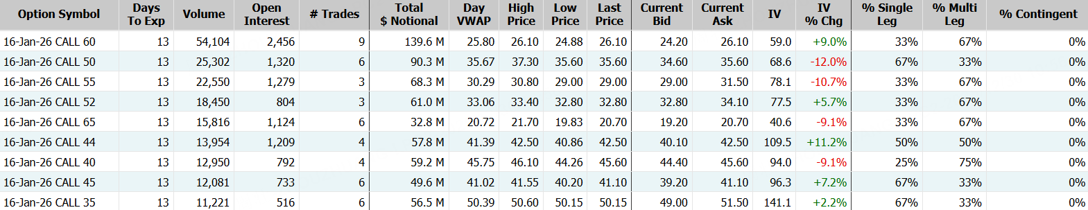 Silver Miners ETF成交25.9萬張,較90日均量放大逾51倍,看漲期權佔比98.8%,其中於2026年1月16日到期60美元行使價的看漲期權成交居前,成交逾5.4萬張。
