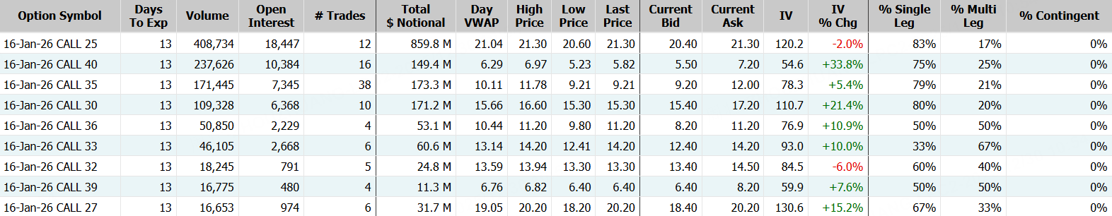 Global X Uranium ETF成交119.12萬張,較90日均量放大逾61倍,看漲期權佔比99.7%,其中於2026年1月16日到期25美元行使價的看漲期權成交居前,成交逾40萬張;