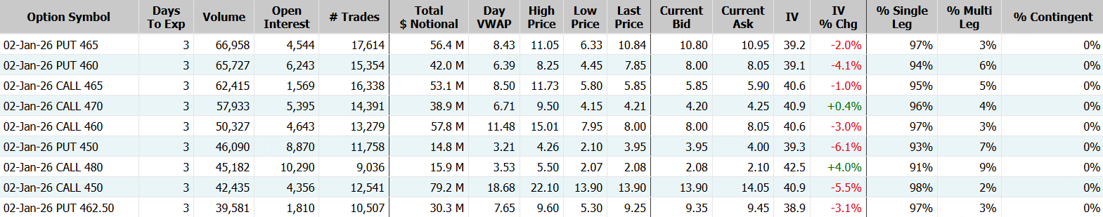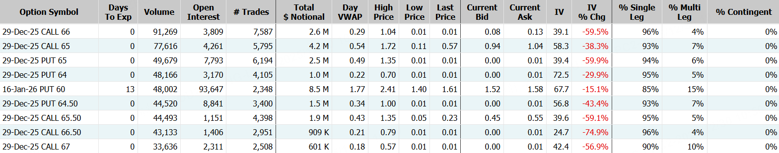 特斯拉隔夜股價大跌逾3%,領跌科技七巨頭;期權方面,特斯拉成交176.1萬張,看漲期權佔比回落至56.4%,其中於2026年1月2日到期的465美元行使價的看跌期權成交居前,成交近6.7萬張;此外,從期權鏈上看,特斯拉多張於本週五到期的Put單翻倍大漲。