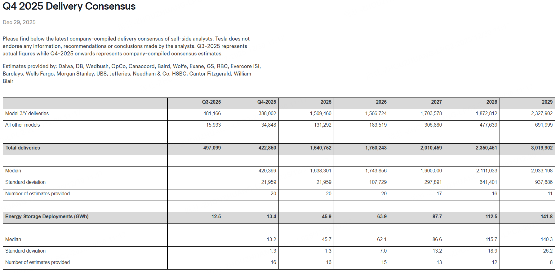 多年來,特斯拉一直會匯總賣方分析師的預測數據,但這類信息通常僅由投資者關係團隊通過郵件,私下分享給指定的分析師及主要投資者。然而在今日,該公司決定將這份數據公之於衆:特斯拉稱這份共識預期爲“企業自主匯總”,其中顯示 2025 年第四季度交付量的市場中位預期值爲 420,399 輛,均值預期則爲 422,850 輛。