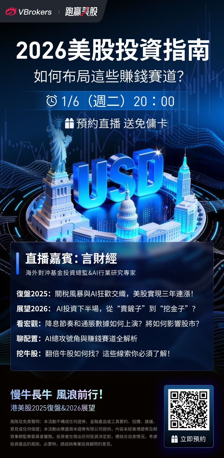 點此進入直播間:【跑贏美股】2026美股投資指南:如何佈局這些賺錢賽道?點擊下方“馬上預約”,每個賬戶可免費領取價值 $5 USD 美股免佣卡!