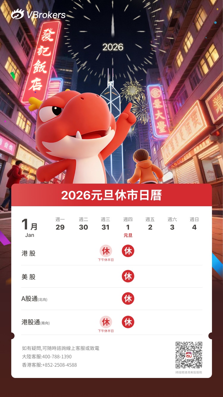 2025年12月31日(星期三)港股將只有半日交易(交易時間爲09:00-12:00),下午休市。2026年1月1日(星期四)全天休市,1月2日(星期五)起照常開市。