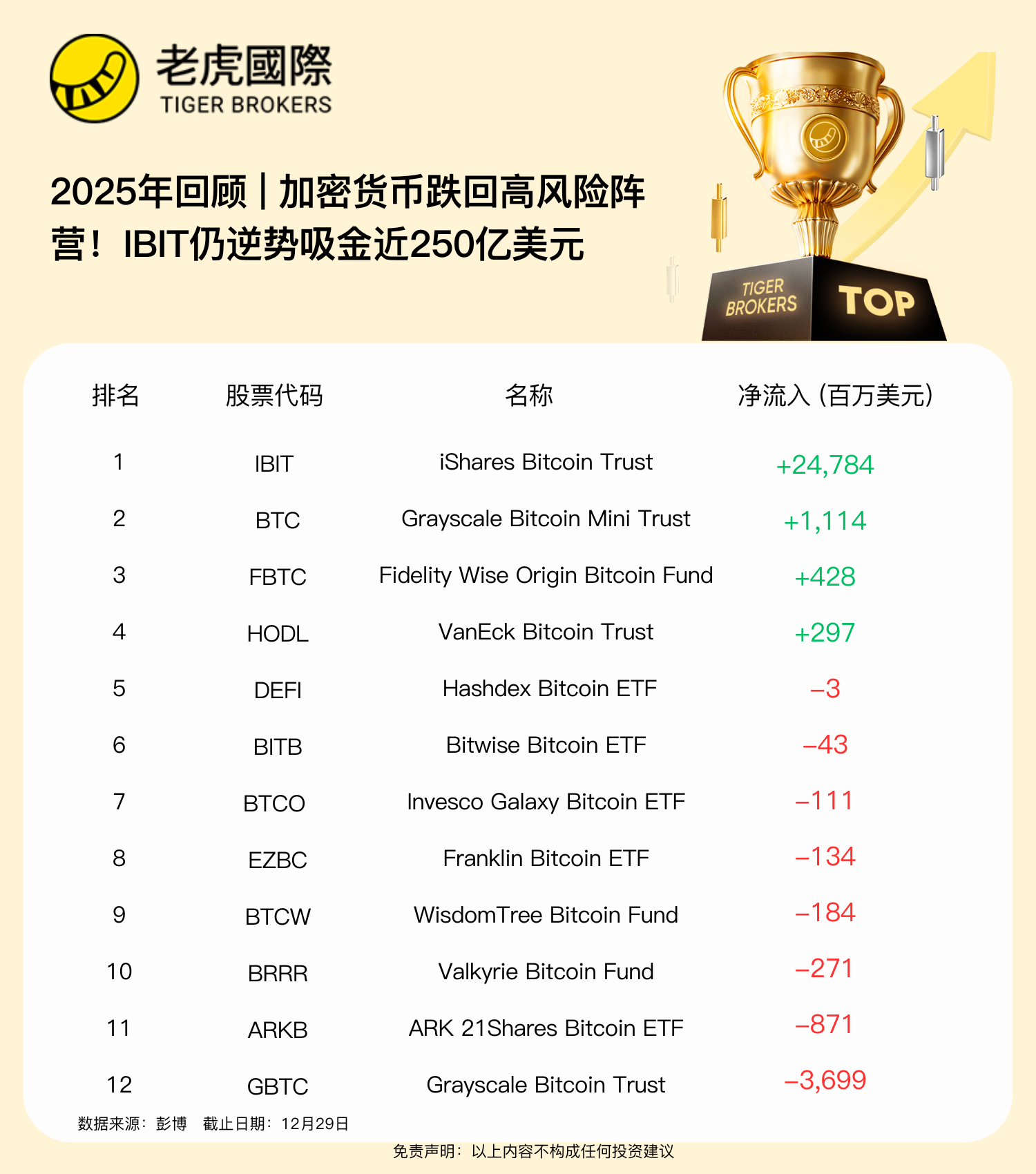 2025年對全球最大加密貨幣比特幣而言,可謂是大起大落的一年,經歷了數次創紀錄高點與暴跌,該幣種正面臨自近三年以來首個年度下跌的風險。儘管比特幣價格下跌,但貝萊德旗下的iShares Bitcoin Trust(IBIT)今年仍吸引了近250億美元的資金流入,該基金目前以較大優勢領先於競爭對手。