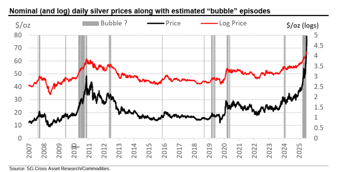 法國興業銀行(Societe Generale)採用對數週期冪律奇點(LPPLS)框架的模型顯示,白銀在2025年的表現與歷史上的泡沫階段相似。