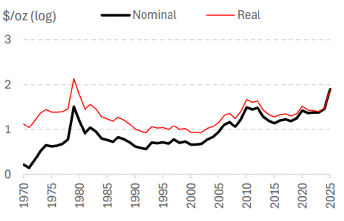 法國興業銀行由全球大宗商品研究主管 Mike Haigh 博士領導的研究團隊指出,如果不使用傳統的線性圖表,而是改用對數刻度的時間序列圖來觀察銀價走勢,那麼2025年的這輪上漲看起來就遠沒有那麼誇張。對法興而言,這反映的是“在過去25年裏,白銀一直在運行的同一種複利式增長邏輯”。