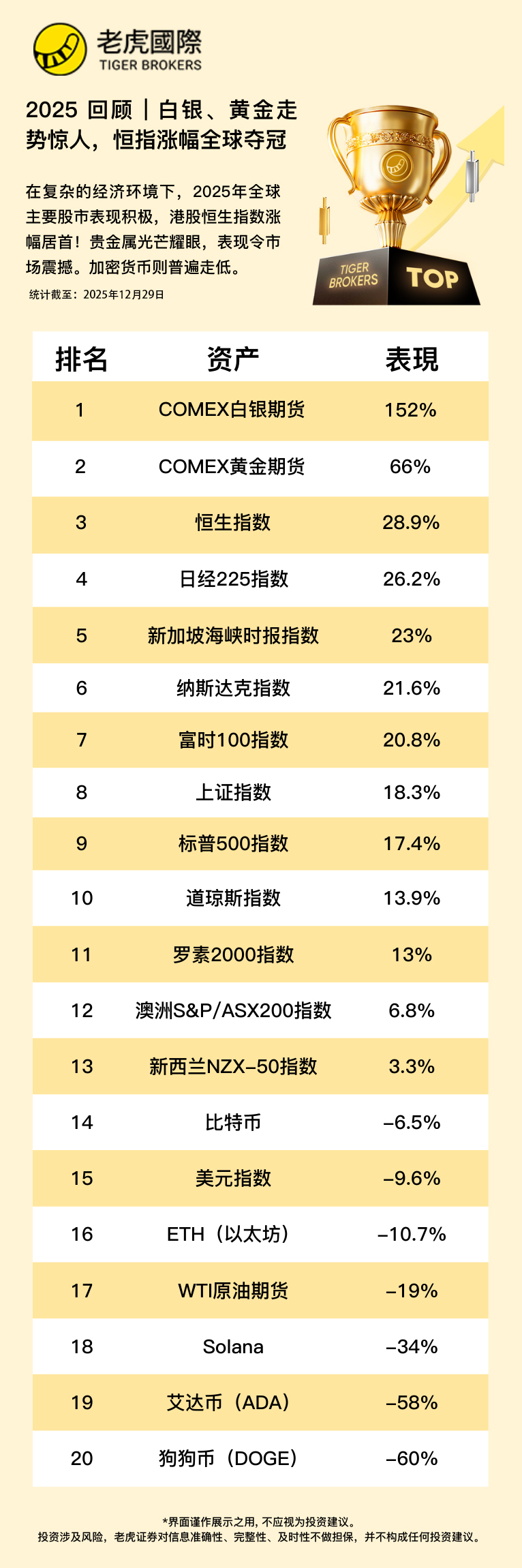 2025年即將過去,在複雜的經濟環境下,全球大類資產表現不一。主要股市走勢震盪,但全年均收穫漲勢,其中,港股恒生指數以近30%的累計漲幅居首!貴金屬光芒耀眼,白銀、黃金的年末表現令市場震撼。加密貨幣則普遍走低。