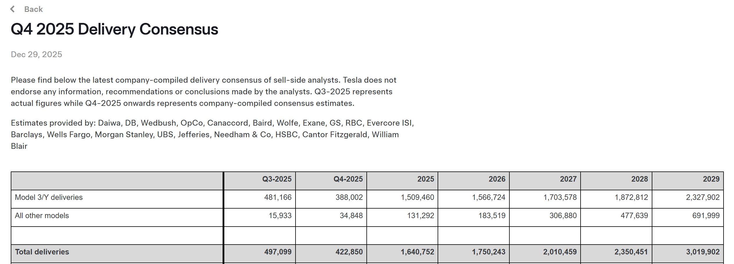 特斯拉 週二在其網站上公佈了包括巴克萊、富國銀行、摩根士丹利、瑞銀、傑富瑞等多家大行分析師對Q4車輛交付量的預估匯總數據。根據特斯拉的統計,分析師平均預計第四季度交付量爲422,850輛,比去年同期下降15%。