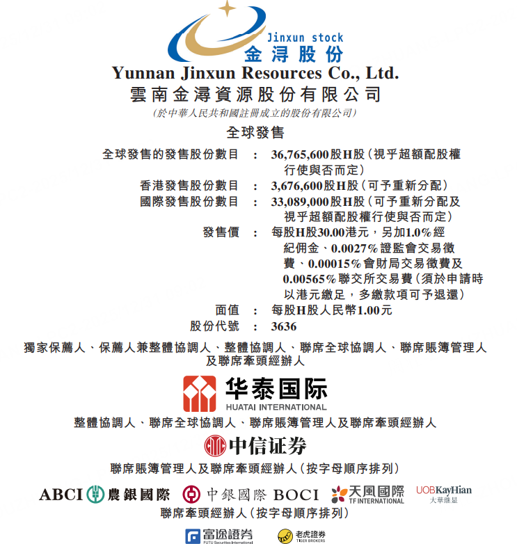 12月31日, 金潯資源於12月31日至1月6日招股,公司擬全球發售3676.56萬股H股,其中,香港發售佔10%,國際發售佔90%,另有超額配股權15%。每股發售價30港元,每手200股,預期將於1月9日在聯交所開始買賣。