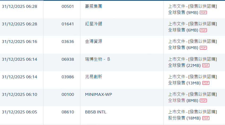 MiniMax、兆易創新、豪威集團、紅星冷鏈、金潯資源、瑞博生物-B、BBSB INTL今日啓動招股。