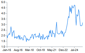 | 圖表5:人民幣SWIFT支付份額時有波動 人民幣佔SWIFT支付的份額,% |
