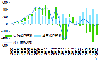 自2007年以來,中國經常賬戶順差佔GDP比重有所下降,但仍然可觀,近五年平均佔比爲2%左右。與此同時,資本流出—包括近期對外直接投資上升,反映企業爲應對關稅戰的衝擊將部分產能遷至境外—大體上抵消了經常賬戶順差,外匯儲備基本穩定在略高於3萬億美元的水平。