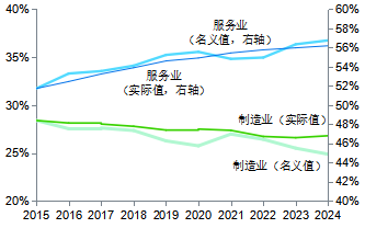 | 圖表3:製造業佔GDP比重呈緩慢下降趨勢 製造業和服務業增加值佔GDP比重,% |