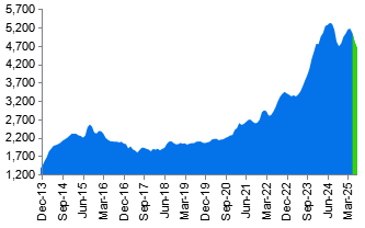 | 圖表4:RGI經歷多年大幅上升後,近期顯露放緩跡象 渣打人民幣國際化指數(RGI),綠色爲最新數據(2025年5月至7月) |