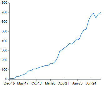 近年來,政府推動人民幣成爲國際主要貨幣的意願更爲明顯。美國政府高負債能否持續,以及美聯儲政策獨立性會不會受損等議題引發了市場普遍擔憂,在全球尋求可替代安全資產的背景下,中國正在積極地推進人民幣國際化,減少對美元的依賴。隨着中國持續在全球範圍內推動貿易和投資多元化,預計政府會進一步推動在國際交易(包括與“一帶一路”沿線經濟體的交易)和大宗商品定價中更多使用人民幣。與此同時,預計中國會進一步開放和深化金融市場,提供更豐富的人民幣金融產品,增強人民幣資產對外國投資者的吸引力。今年9月,中國宣佈支持可在中國債券市場開展債券現券交易的境外機構投資者開展債券回購業務。