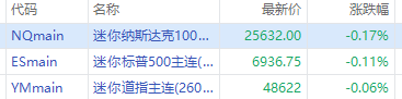週三盤前,三大股指期貨齊跌,截至發稿,納指期貨 $NQmain 跌0.17%,標普500期貨 $ESmain 跌0.11%,道指期貨 $YMmain 跌0.06%。