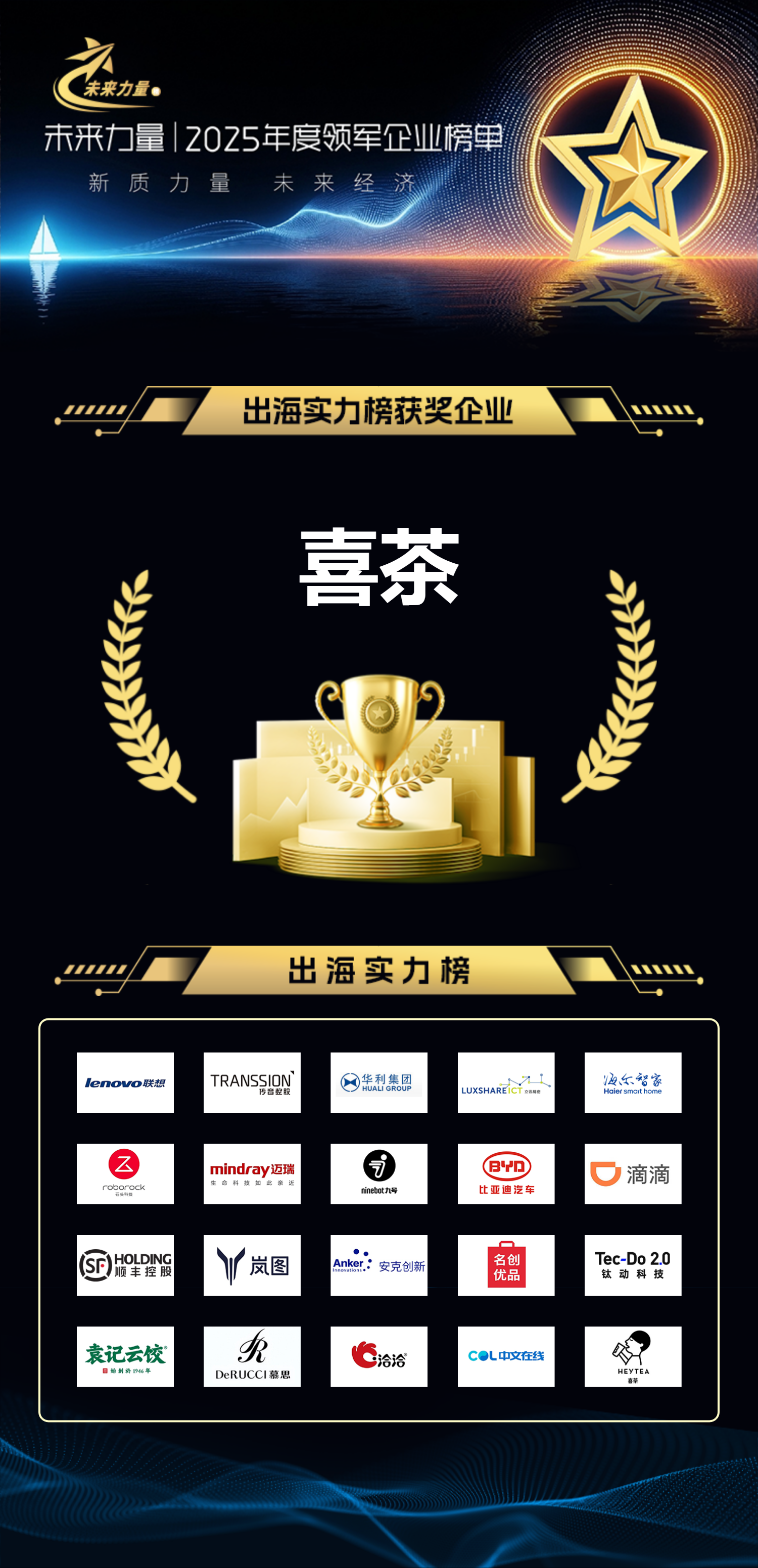12月31日,證券之星發佈2025年“未來力量”領軍企業榜單,喜茶憑藉在海外市場卓越的拓展能力、產品創新與品牌建設,成功入選“出海實力榜”,成爲新茶飲行業國際化發展的標杆企業。