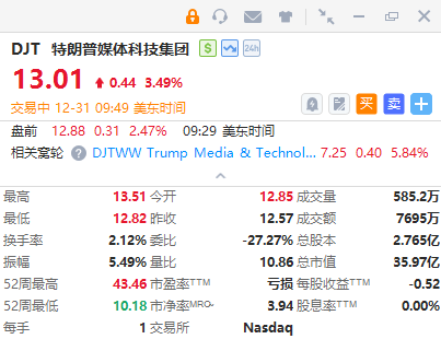 特朗普媒體科技集團漲約3.5%,此前宣佈計劃向股東分發數字代幣。