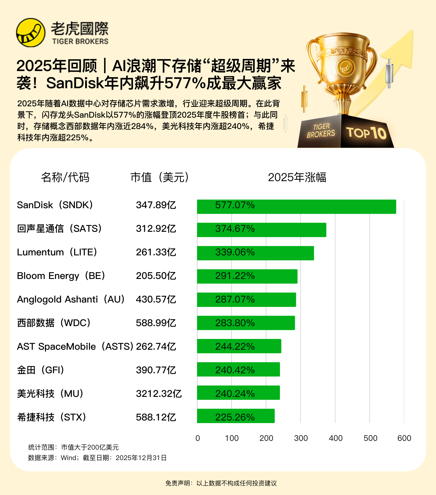 2025年隨着AI數據中心對存儲芯片需求激增,行業迎來超級週期。在此背景下,閃存龍頭SanDisk以577%的漲幅登頂2025年度牛股榜首;與此同時,存儲概念西部數據年內漲近284%,美光科技年內漲超240%,希捷科技年內漲超225%。
