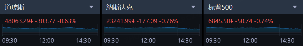 週三,美股市場延續了聖誕節後的回撤行情,三大指數集體收跌,爲2025年畫上了低調的句號。截至收盤,標準普爾500指數跌0.74%,報6845.5點;納斯達克綜合指數跌0.76%,報23241.99點;道瓊斯工業平均指數跌0.63%,報48063.29點。