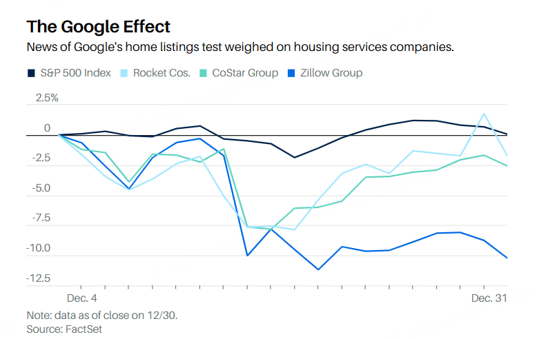 作爲試點項目的一部分,這家搜索巨頭開始在部分谷歌搜索結果頂部展示房源列表。谷歌可能進軍房源信息業務的消息令該領域的主導公司股價承壓。12 月 15 日,有關谷歌測試的消息在社交媒體上傳播後,Zillow Group 的市值蒸發了約 15 億美元。Homes.com 的母公司 CoStar Group 的股價跌至三年多來的最低水平。此後兩者雖有所回升,但尚未完全恢復。