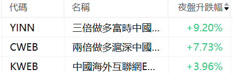 美股夜盤,在美國上市的中國資產亦紛紛上漲,其中 三倍做多富時中國ETF-Direxion 大漲9%以上, 兩倍做多滬深中國互聯網股票ETF-Direxion 漲逾7.7%,代表着藍籌股的 中國海外互聯網ETF-KraneShares 大漲近4%