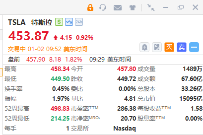 特斯拉漲近1%,2025全年汽車交付量達164萬輛。
