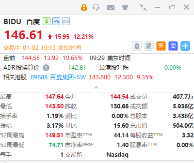 華盛資訊1月2日訊,熱門中概股大幅上揚!百度飆升12%,公司宣佈分拆崑崙芯赴港上市;