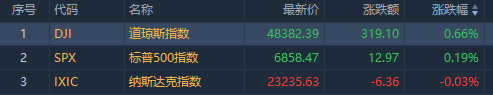 上週五,美股三大指數漲跌不一,截至收盤,道指漲319.10點,漲幅爲0.66%,報48382.39點;納指跌6.36點,跌幅爲0.03%,報23235.63點;標普500指數漲12.97點,漲幅爲0.19%,報6858.47點。