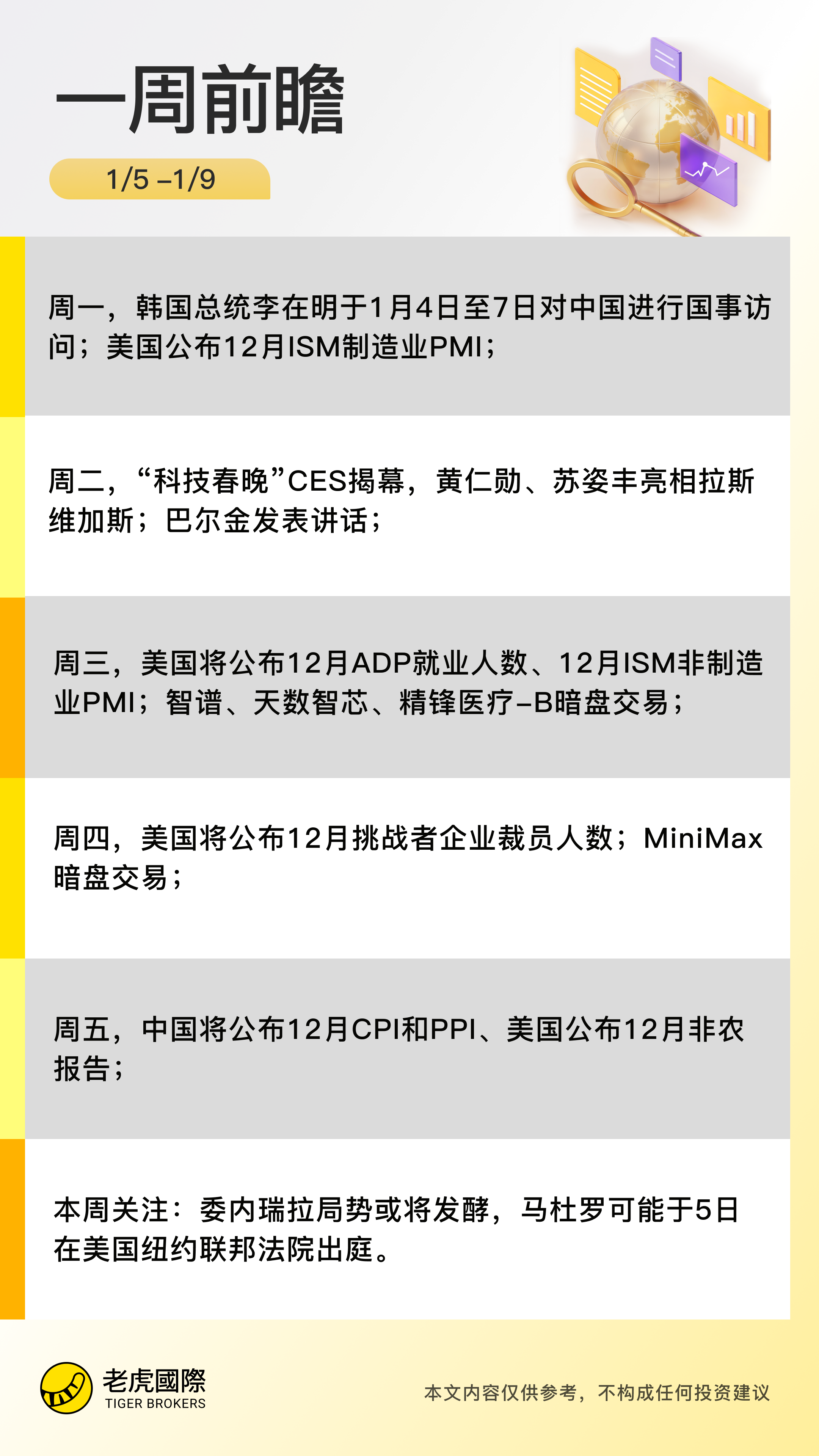 此外,還有ISM製造業、非製造業PMI和12月ADP就業數據、JOLTS職位空缺數據等將發佈。投資者將評估美國經濟的健康狀況以及美聯儲下一次降息的可能時機。