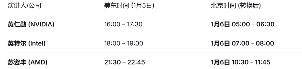 其中,黃仁勳將於1月5日美東時間16:00–17:30發表主題演講,美東時間18:00–19:00爲英特爾發佈會,當日美東時間21:30-22:45蘇姿豐將發表演講。