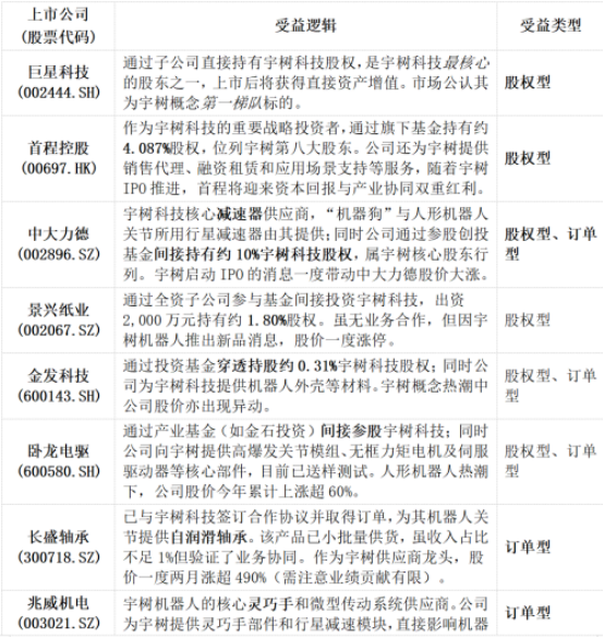 其中,市場公認的代表包括:巨星科技(002444.SZ),被視爲宇樹科技概念股中股權關係最爲直接、邏輯最硬的標的。公司通過子公司直接持有宇樹科技股權,宇樹科技一旦上市,其對應權益將直接反映爲資產增值,是A股市場中最典型的“宇樹上市受益股”。京山輕機(000821.SZ)通過產業投資基金參與了宇樹科技的早期投資。雖然持股比例相對有限,但在宇樹科技上市預期催化下,仍具備一定的股權重估彈性。臥龍電驅(600580.SH)、景興紙業(002067.SZ)、金髮科技(600143.SH)上述公司均通過產業基金或子公司間接持有宇樹科技股權。其中,金髮科技披露的穿透持股比例約爲0.42%。這類公司在市場情緒階段往往表現活躍,但從中長期看,其受益程度取決於持股比例、會計處理方式及是否具備進一步加碼或協同的可能性。