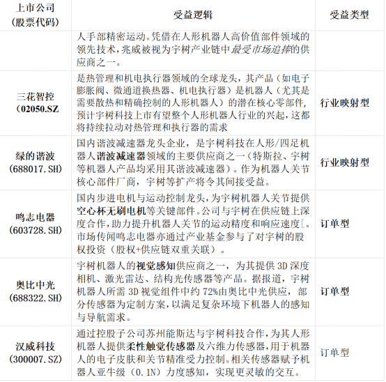 典型代表包括:三花智控(002050.SZ),該公司是熱管理和機電執行器領域的全球龍頭,其產品(如電子膨脹閥、微通道換熱器、機電執行器)是機器人(尤其是需要散熱和精確控制的人形機器人)的潛在覈心零部件,預計宇樹科技上市將帶動整個人形機器人行業的興起,從而持續拉動對熱管理和執行器的需求。綠的諧波(688017.SH),該公司爲國內諧波減速器龍頭,是機器人核心零部件的代表性公司。任何人形機器人廠商擴產,均將間接利好該類企業。匯川技術(300124.SZ)在伺服系統、電機與自動化領域具備深厚積累,市場預期其可能逐步切入人形機器人供應體系,受益於行業整體成長。江蘇北人(688218.SH)旗下子公司同樣佈局四足機器人研發,屬於宇樹科技的同行對標企業。宇樹科技若以較高估值上市,可能爲其提供估值參照與板塊溢價。