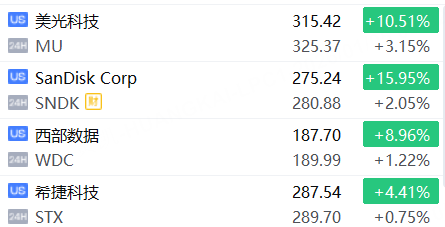 1月5日,美股夜盤時段,存儲概念股續漲。美光科技漲超3%,SanDisk Corp漲超2%, 西部數據、希捷科技跟漲。