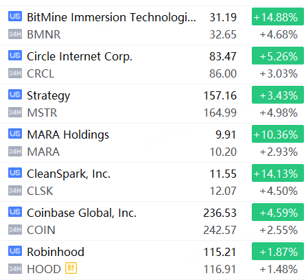 加密貨幣概念股夜盤普漲,BitMine、Strategy、CleanSpark漲超4%,Circle漲超3%,Coinbase漲超2%,Robinhood漲超1%。