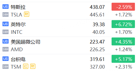 部分明星股夜盤上漲,臺積電漲超2%,英特爾、AMD、特斯拉漲超1%。