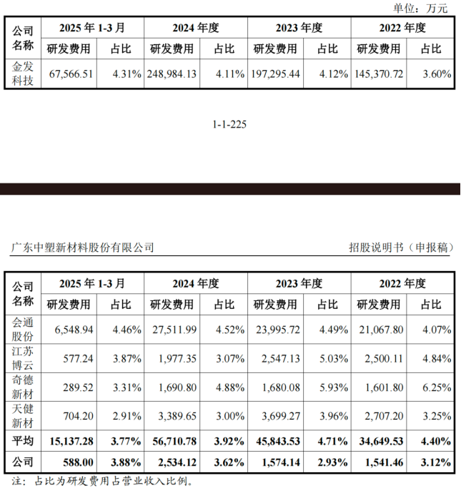 對此,中塑股份解釋稱,金髮科技、會通股份屬於行業頭部企業,其業務規模大,產品線較多,研發投入遠高於同行業其他公司;江蘇博雲人均薪酬較高,導致整體研發投入高於公司;奇德新材與公司研發投入 規模接近,但其收入規模較小,因此研發費用率高於公司;天健新材因營收規模及研發投入策略等因素,與公司各期研發費用率存在一定波動,但整體水平較爲接近。