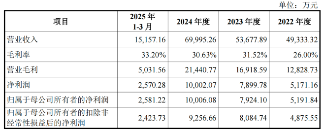 招股書顯示,2022年至2024年,公司營業收入從4.93億元增長至7億元,歸母淨利潤由5191.84萬元提升至1億元,整體業績保持增長。然而,在財務數據向好的背後,卻隱藏多重壓力。