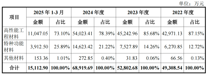 另一方面,被公司視爲新增長動力的特種功能材料板塊收入持續攀升,尤其在2024年同比增長近50%,但目前該業務營收佔比仍相對較低。此外,儘管該板塊銷售單價高於高性能工程材料,但報告期內亦呈現波動下行趨勢。各期單價分別爲4.76萬元/噸、4.49萬元/噸、4.55萬元/噸和4.51萬元/噸。