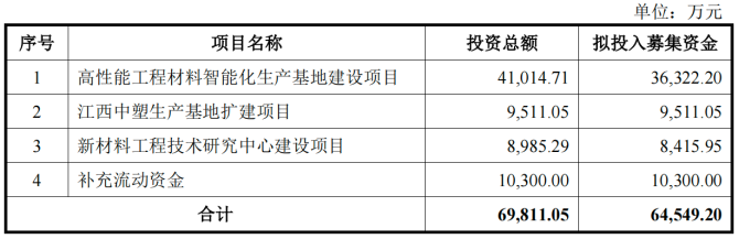 招股書顯示,中塑股份擬募集資金6.45億元,其中超七成將用於“高性能工程材料智能化生產基地”和“江西中塑生產基地擴建”兩大項目。公司計劃通過購置自動化生產線並應用智能化生產管理軟件,建設自動化水平更高的智能生產基地,以實現高性能工程材料、特種功能材料及其他改性塑料的規模化生產。