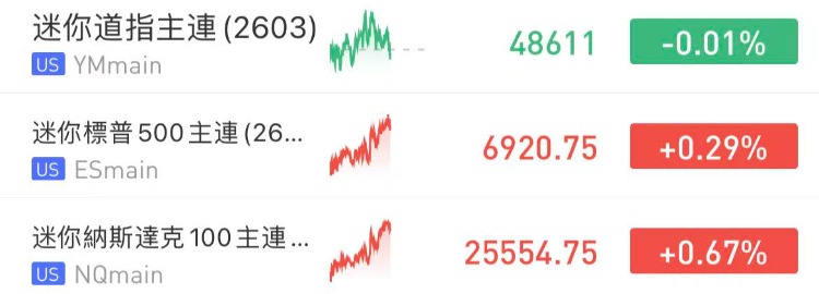 盤前美股三大股指期貨漲跌不一,截至發稿,納指期貨 $NQmain 漲0.67%,標普500期貨 $ESmain 漲0.29%,道指期貨 $YMmain 微跌0.01%。