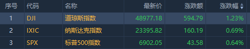 截至昨日收盤,三大指數集體收漲,道指漲594.79點,漲幅爲1.23%,報48977.18點,創歷史新高;納指漲160.19點,漲幅爲0.69%,報23395.82點;標普500指數漲43.58點,漲幅爲0.64%,報6902.05點。