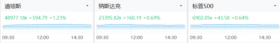 截至收盤,道指漲594.79點,漲幅爲1.23%,報48977.18點;納指漲160.19點,漲幅爲0.69%,報23395.82點;標普500指數漲43.58點,漲幅爲0.64%,報6902.05點。