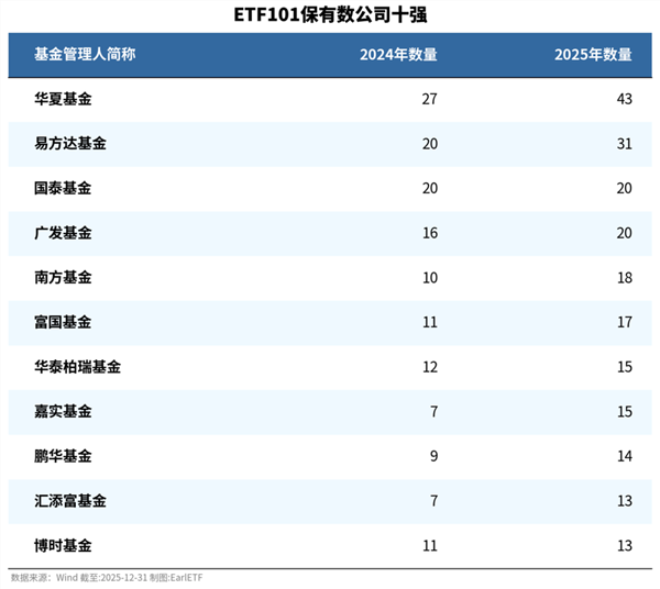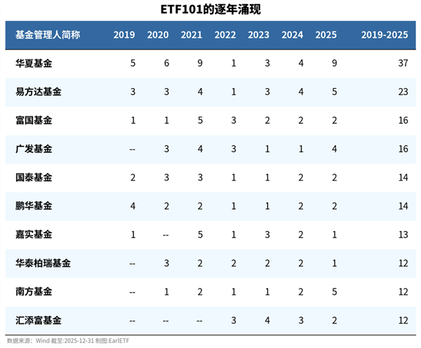 下表是我在《激盪2025:ETF的進化與分化 | ETF101清單(2025版)》中的一項統計。可以看到,截至 2025 年末,廣發旗下符合 “ETF101” 標準的 ETF 共有 20 只,較上一年增加 4 只,與國泰基金並列第三。