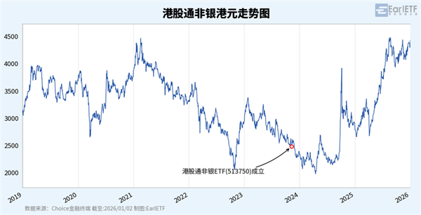 港股通非銀 ETF (513750)的佈局時點也類似。2023 年 11 月 10 日產品成立時,對應的是指數已連跌三年,並一度逼近新低之時。