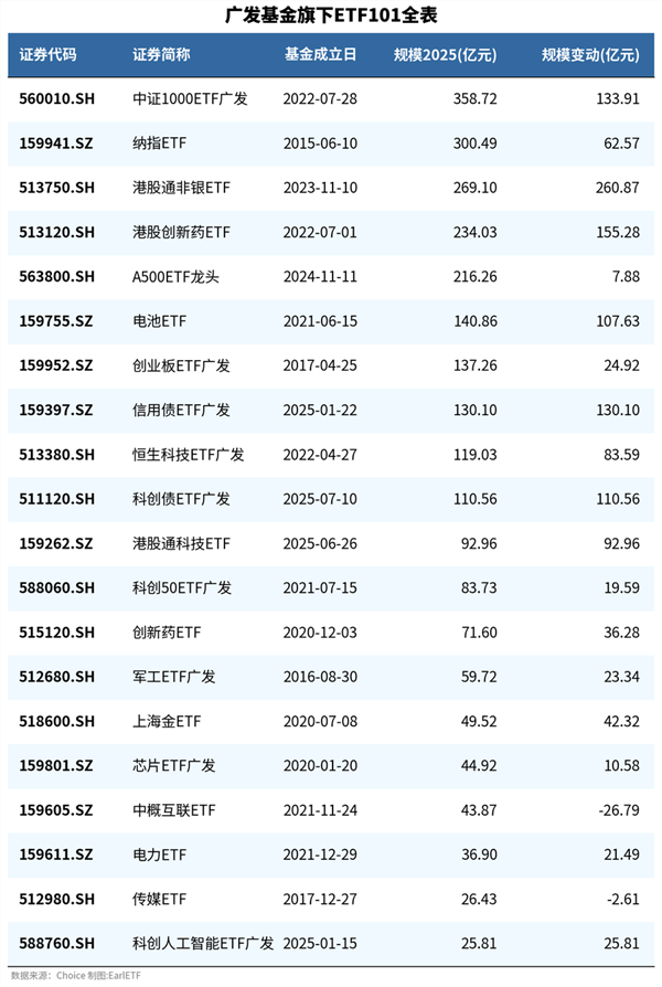截至 2025 年末,廣發旗下滿足 “ETF101” 條件的 ETF 產品共有 20 只(如下表)。