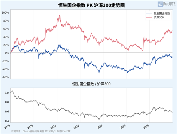 下面這張是恒生中國企業指數與滬深 300 自 2019 年迄今的走勢對比圖,請聚焦副圖的比值圖,當比值向下時,代表恒生中國企業指數跑輸滬深 300,向上則是跑贏。2022 年至 2023 年,正是港股持續跑輸 A 股、底部橫盤,人氣低迷的階段。